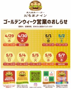 2月、3月の日曜/祝日のラストオーダーは19時に変更になりました。(時間外のご宴会プランはご相談ください)